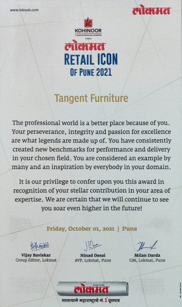 With over two decades of experience, Tangent Furniture has been at the forefront of crafting furniture that breathes life into your spaces. From our humble beginnings, we’ve grown into a trusted brand in Pune, serving over 80,000 satisfied customers and partnering with premium builders like Nyati and Kolte Patil. Our furniture consultants, not just sales executives, guide you through creating spaces that offer solace and comfort. We are dedicated to ensuring that every piece brings joy to your space.